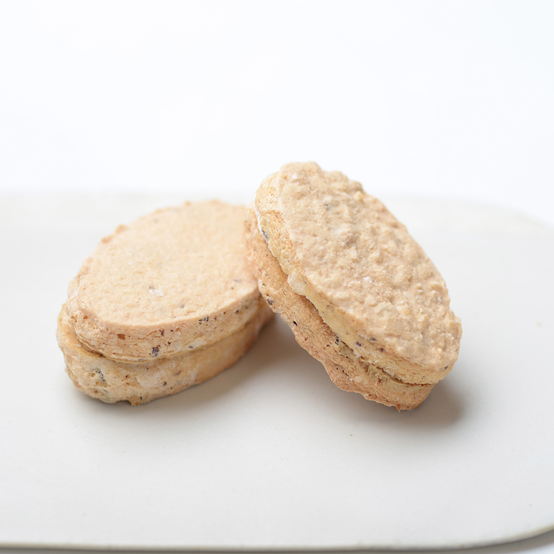 ココナッツとピスタチオを混ぜ込んだメレンゲクッキーと、ココナッツとアーモンドの2層仕立てのサブレをキャラメルクリームで組み立てた、贅沢な構成。ザクザクとした食感とナッツの香ばしさ、キャラメルの濃厚な甘みが絶妙に調和します。